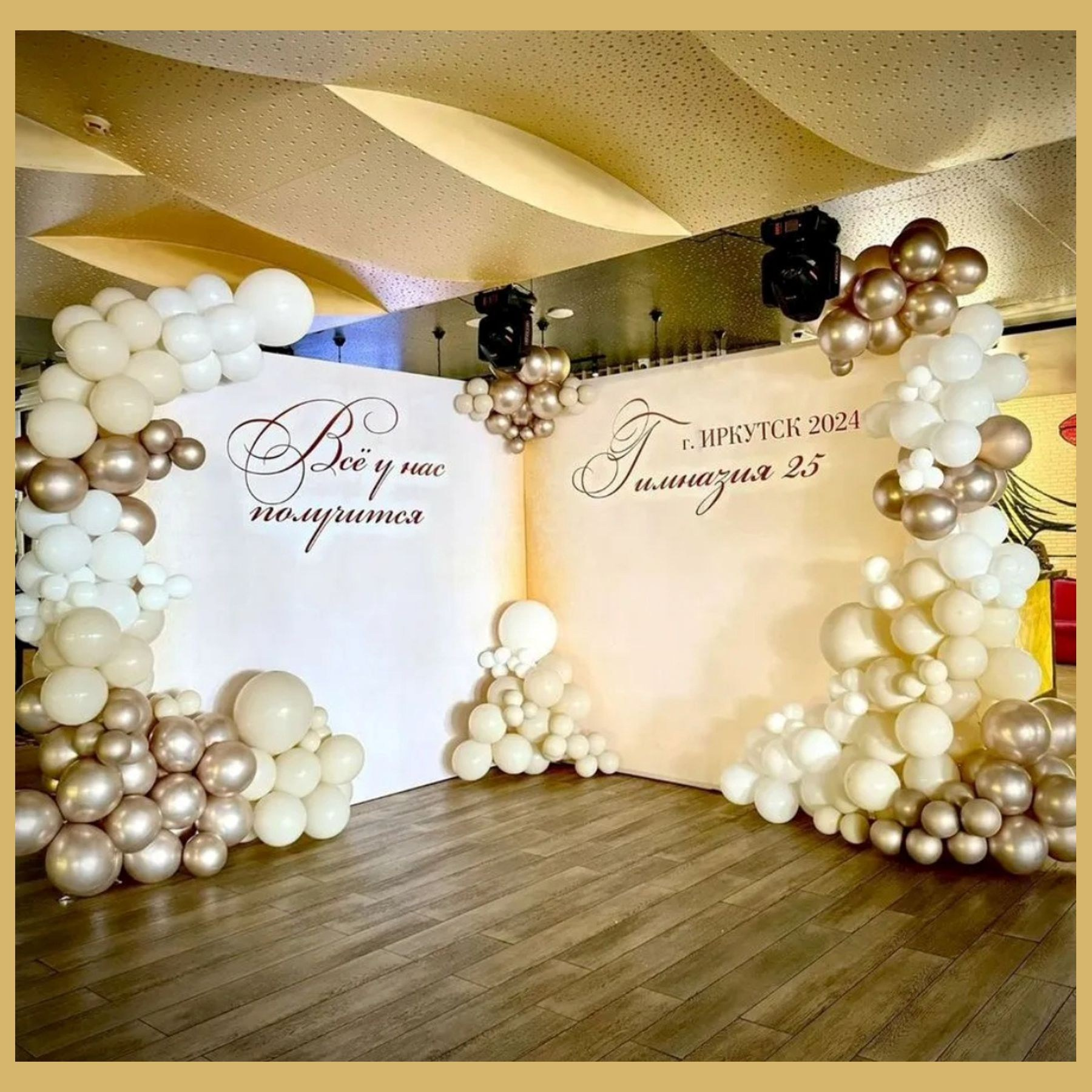 Фотозона представляет собой фон из глянцевого натяжного потолка любого цвета с наклеенной надписью и разнокалиберной гирлянды из шаров по периметру.