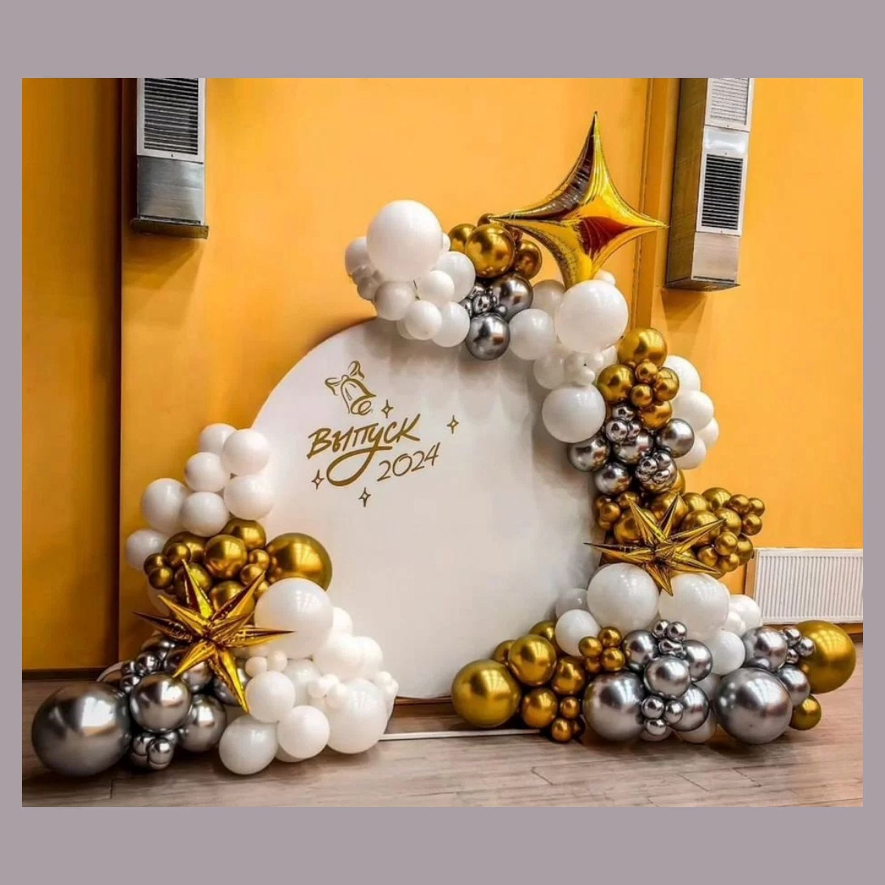 Одна из разновидностей круглой фотозоны, которую вы можете купить в нашей компании, представляет собой металлический каркас, внутри которого находится белый круг. Он в данном случае является фоном для фотографии и видеосъёмки. Именно так выглядит круглая фотозона диаметром 200 см. Он может быть дополнен и украшен различными предметами — воздушными шарами по периметру, цветами, разноцветными лентами, светодиодными гирляндами и т. д. Можно разместить надпись, тематически связанную с проводимым мероприятием.