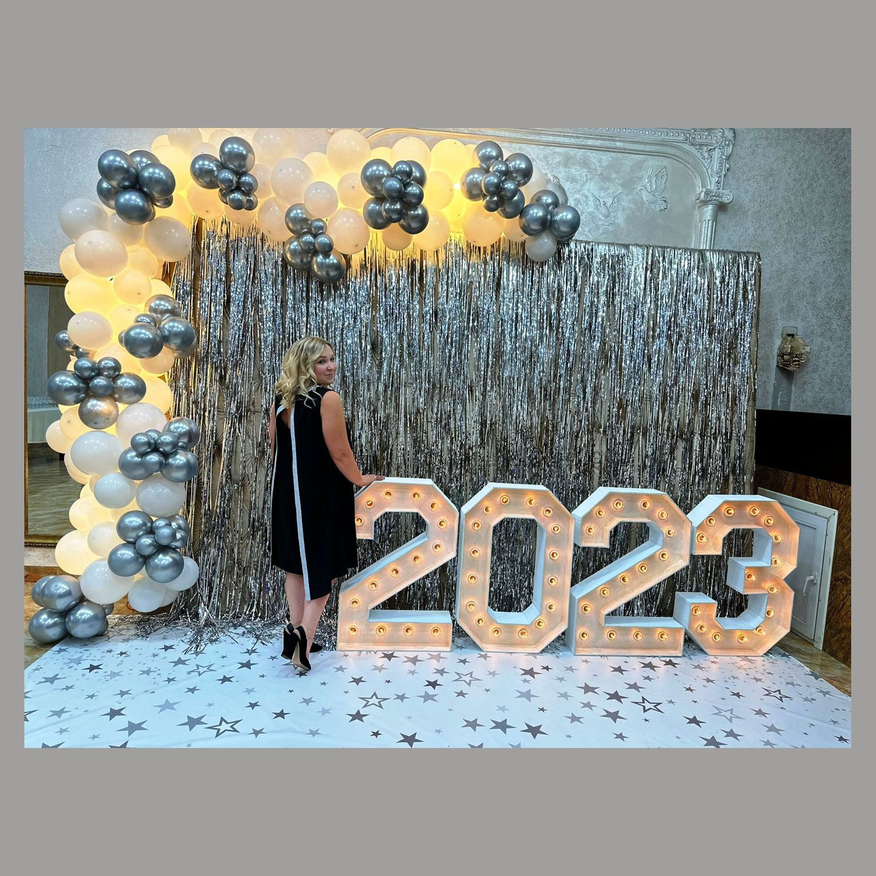 — четыре цифры высотой 100 см надутые воздухом на полянке из шаров;