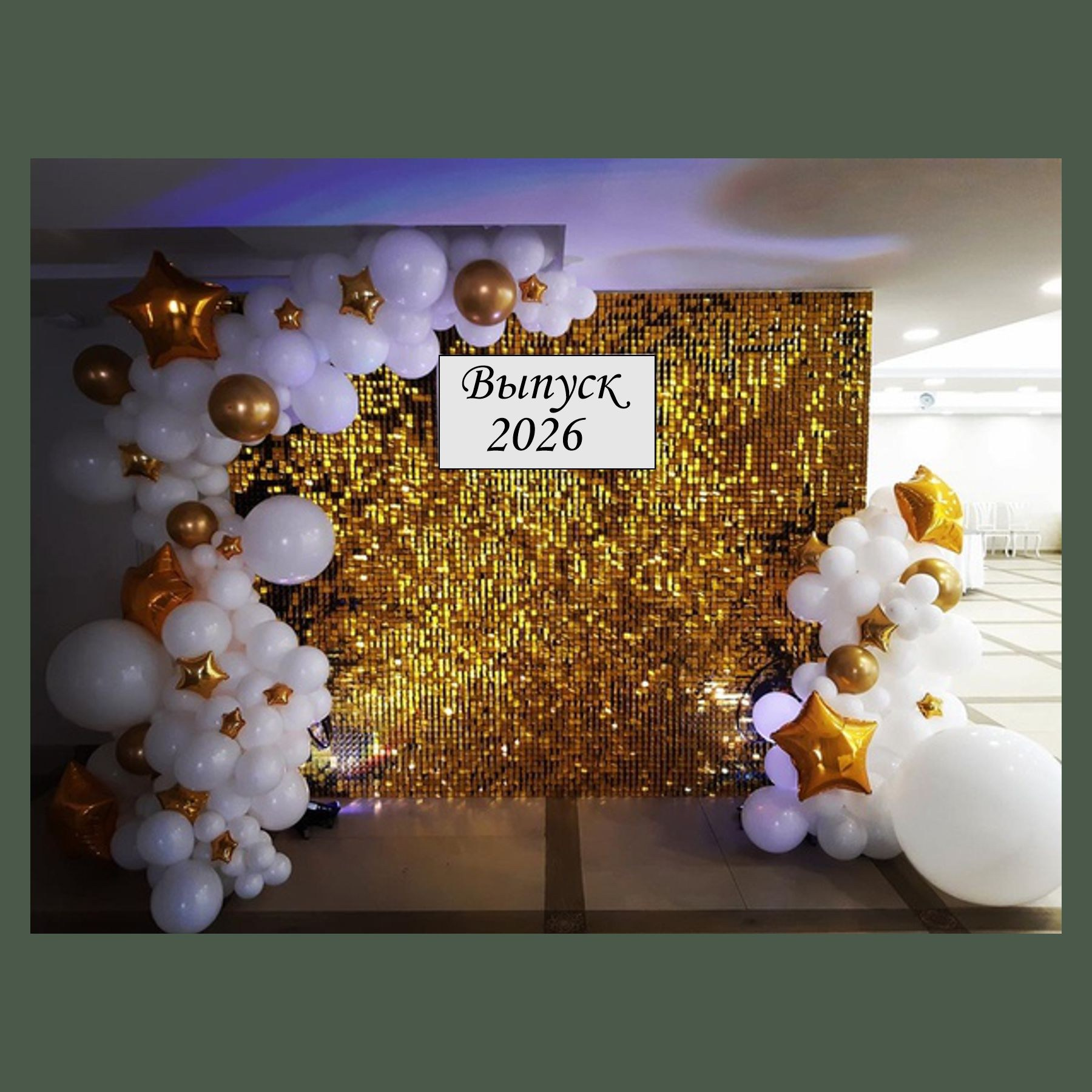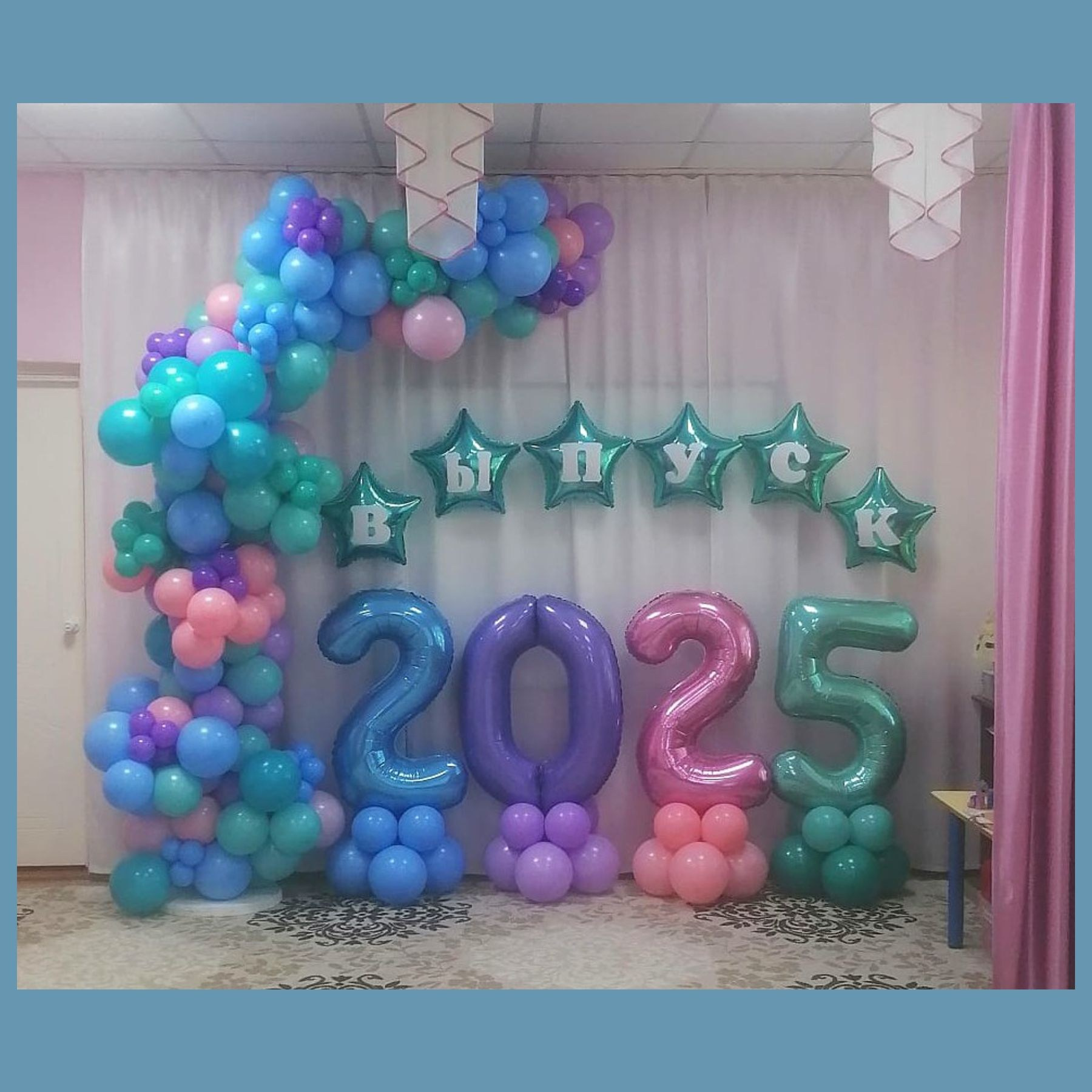 — надпись «ВЫПУСК» на звездах 45 см надутых воздухом и булавкой прикрепленные к шторе;