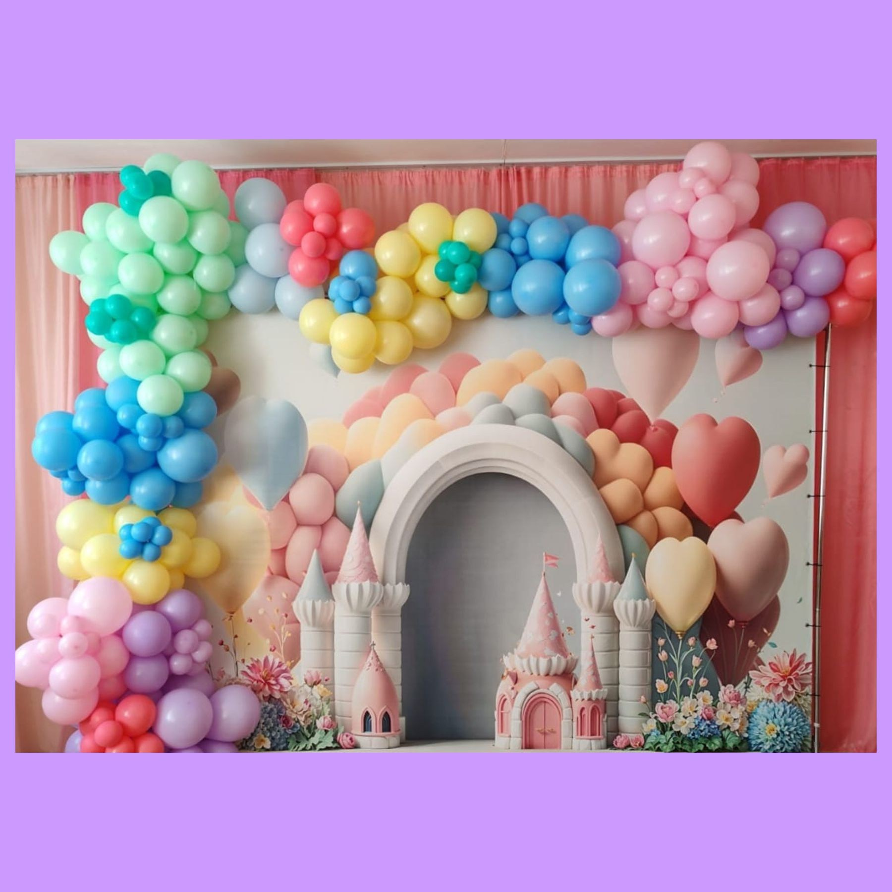 — пятирядная гирлянда из шаров в виде радуги 3,5 м на полянке с цветами;